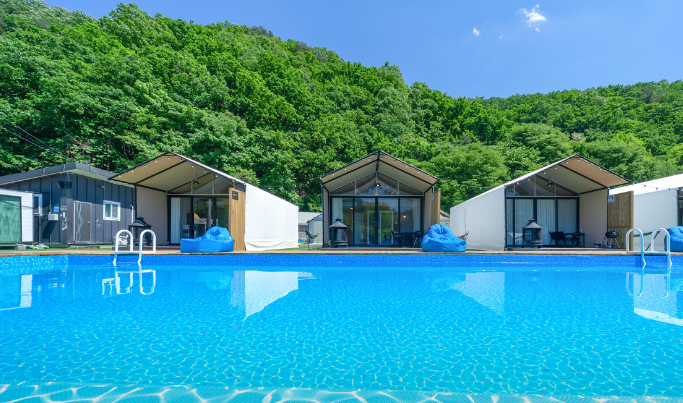 메이플글램핑캠핑장은 수영장을 포함한 다양한 레크리에이션 시설을 갖추고 있어, 가족이나 친구들과 함께 즐거운 시간을 보낼 수 있습니다. 캠핑장 인근에는 CU 편의점이 위치해 있어 필요한 물품을 쉽게 구입할 수 있습니다. 메이플글램핑캠핑장은 신축 객실을 제공하며, 잔디공원과 수영장이 보이는 전망 좋은 위치에 객실이 마련되어 있습니다.