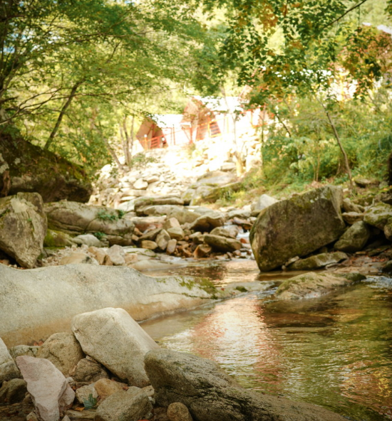 산중호걸 글램핑은 전용 계곡이 있으며, 계곡 상류에 위치해 1급수의 맑은 물이 흐르고, 여름에는 버들치, 개구리 등을 볼 수 있습니다.