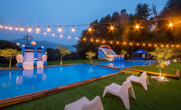 여름에는 큰 수영장이 운영되어 더욱 다양한 야외 활동을 즐길 수 있으며, 트램펄린과 같은 레크리에이션 시설도 갖추고 있습니다.