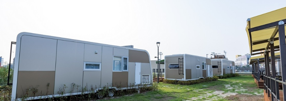 웨이브파크 카라반은 시흥 거북섬 웨이브파크 인근에 있는 캠핑장입니다. 매립으로 생긴 작은 호수 옆에 카라반들이 배치되어 있습니다.