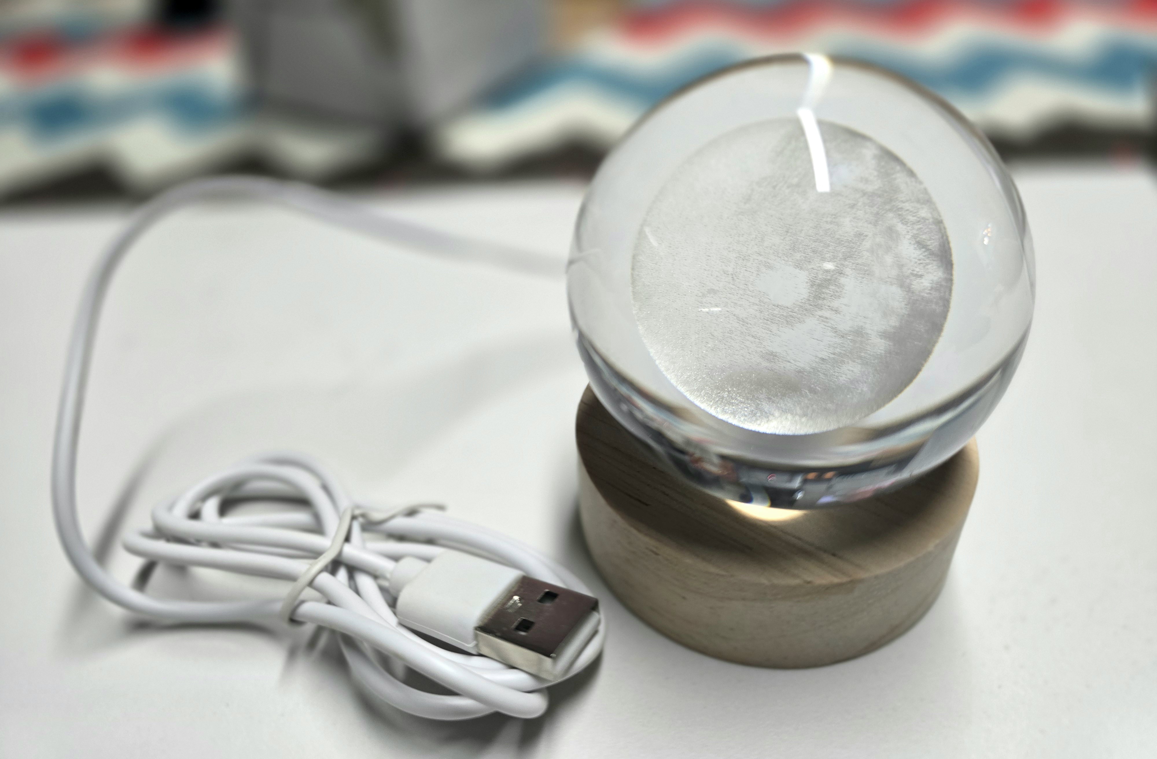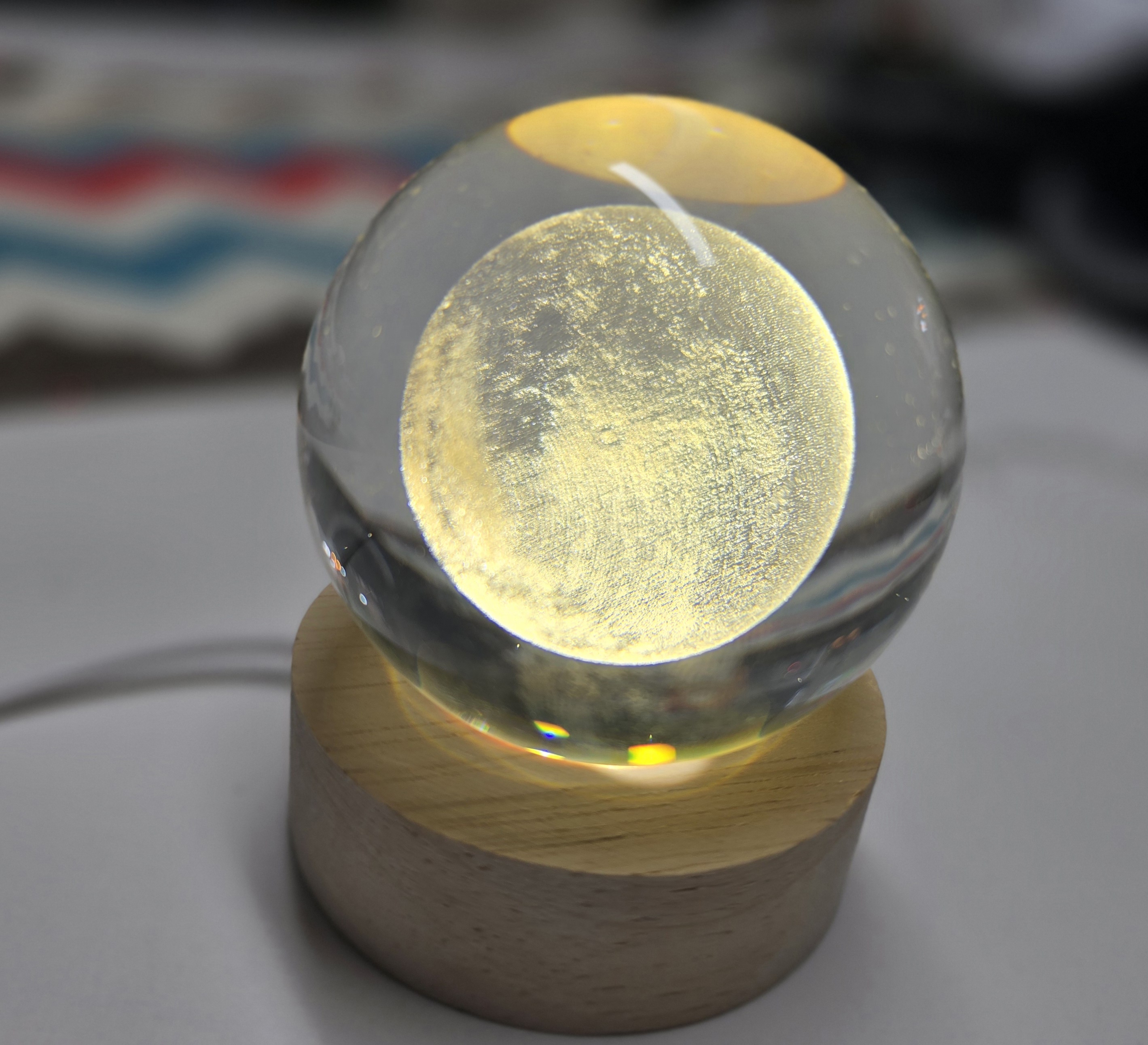 유리구슬 내부에 무늬가 있고 밑에서 조명을 비추면 문양이 더 잘 드러나는 방식의 무드등이다.